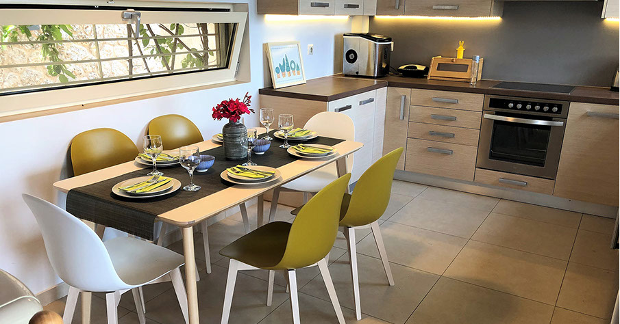The ground floor features a fully equipped modern kitchen with a dining area and a living room with a fireplace, 43” Satellite TV and Hi-Fi stereo equipment. There is direct access to the outdoor area, where the guests can swim in the private pool, enjoy the sun in the sunbeds, use the spacious BBQ and relax around the wooden dining table, while enjoying the amazing view of the surrounding area. The kitchen has all the necessary facilities, including a dishwasher, microwave and espresso coffee maker.